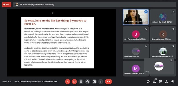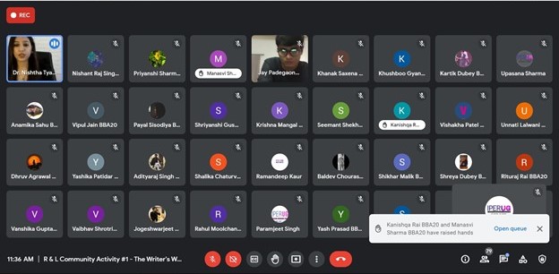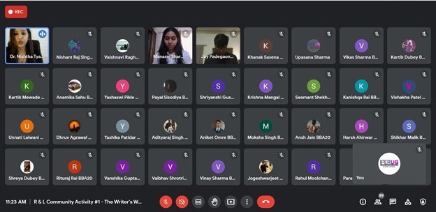 Research and literary community have organized the writer’s workshop on 03/09/2021 at 10:30-11:30 through the virtual platform. Around 148 participants of Second year students of B.COM/BCOM(HONS)/BBA have participated in the workshop. Dr. Nishtha Tyagi (An entrepreneur, HR Professional, Certified Corporate Trainer, Media Professional) was the guest speaker of the workshop.