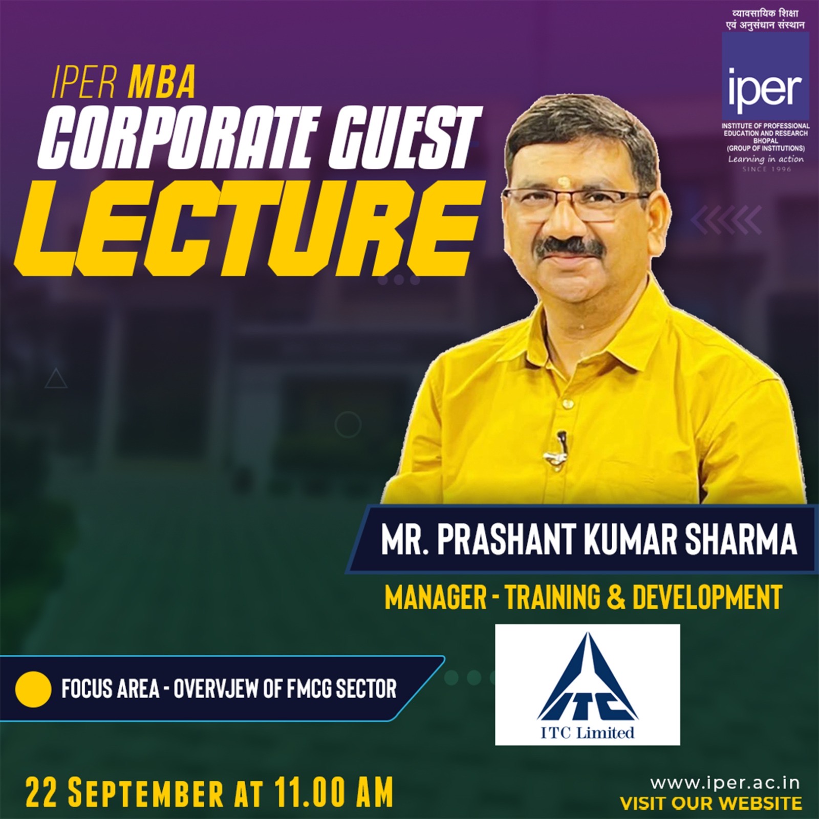 IPER MBA had the privilege of hosting Mr. Prashant Kumar Sharma, Manager – Training & Development, ITC Limited, for an engaging Corporate Guest Lecture with the 1st Semester MBA Students (Class of 2025-27).